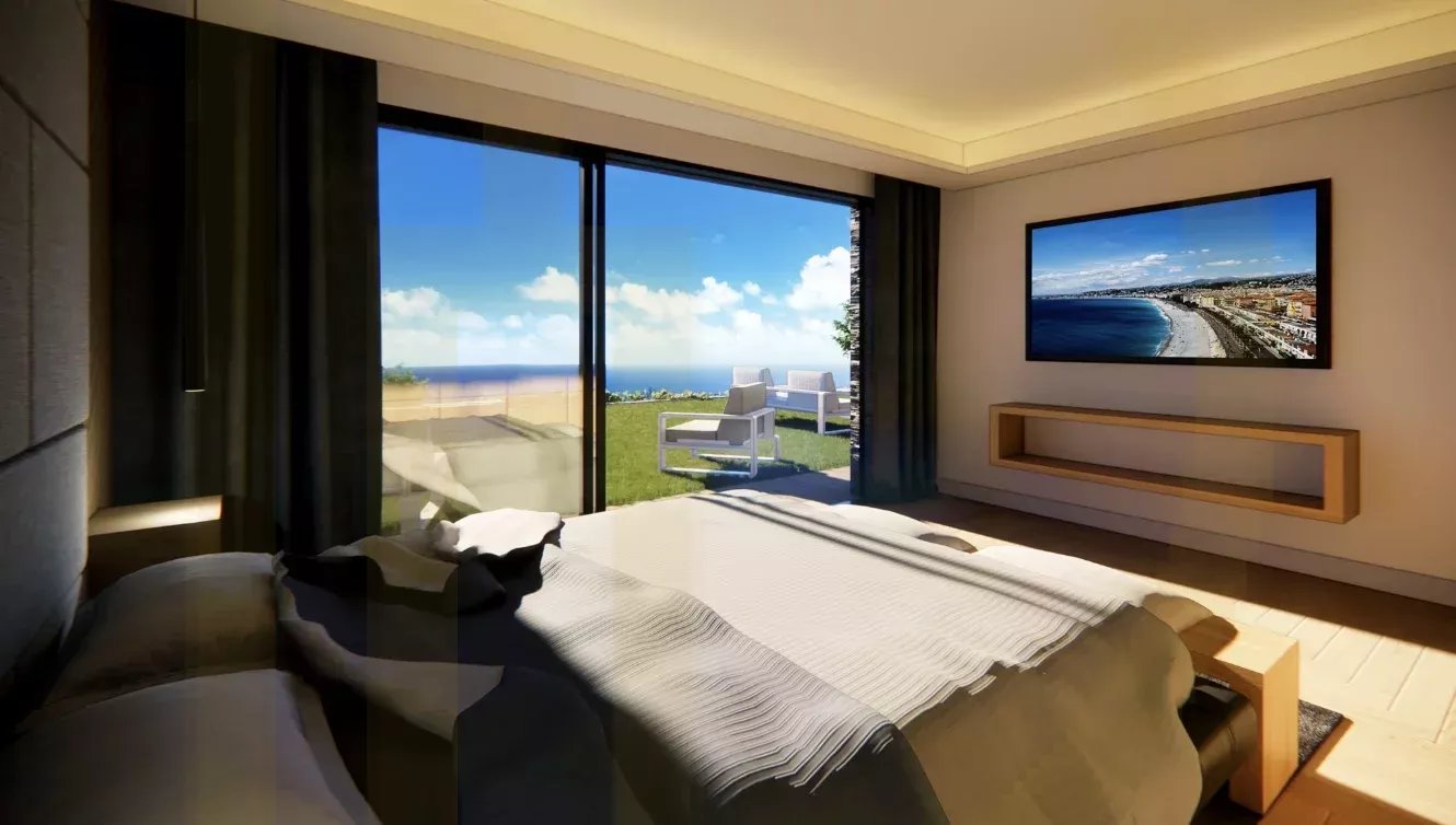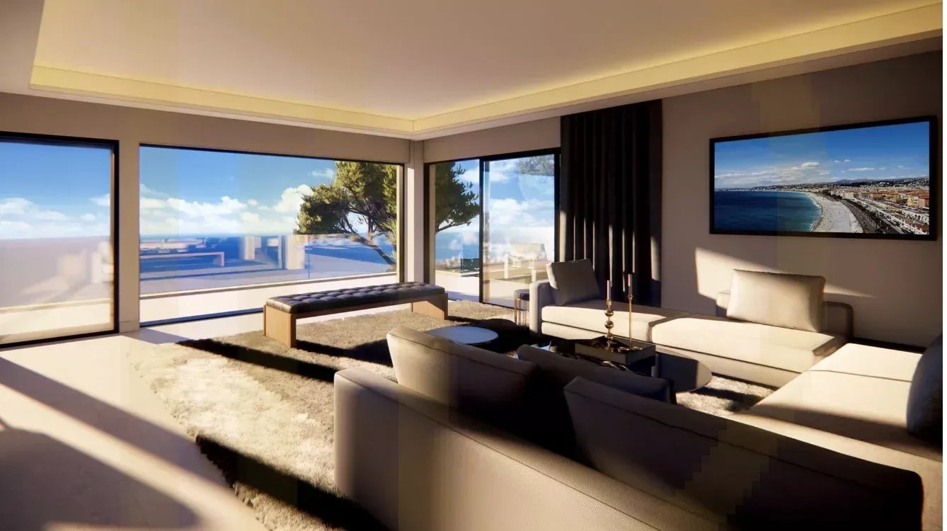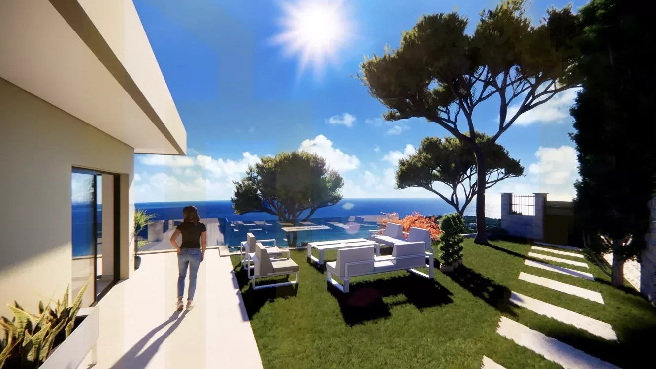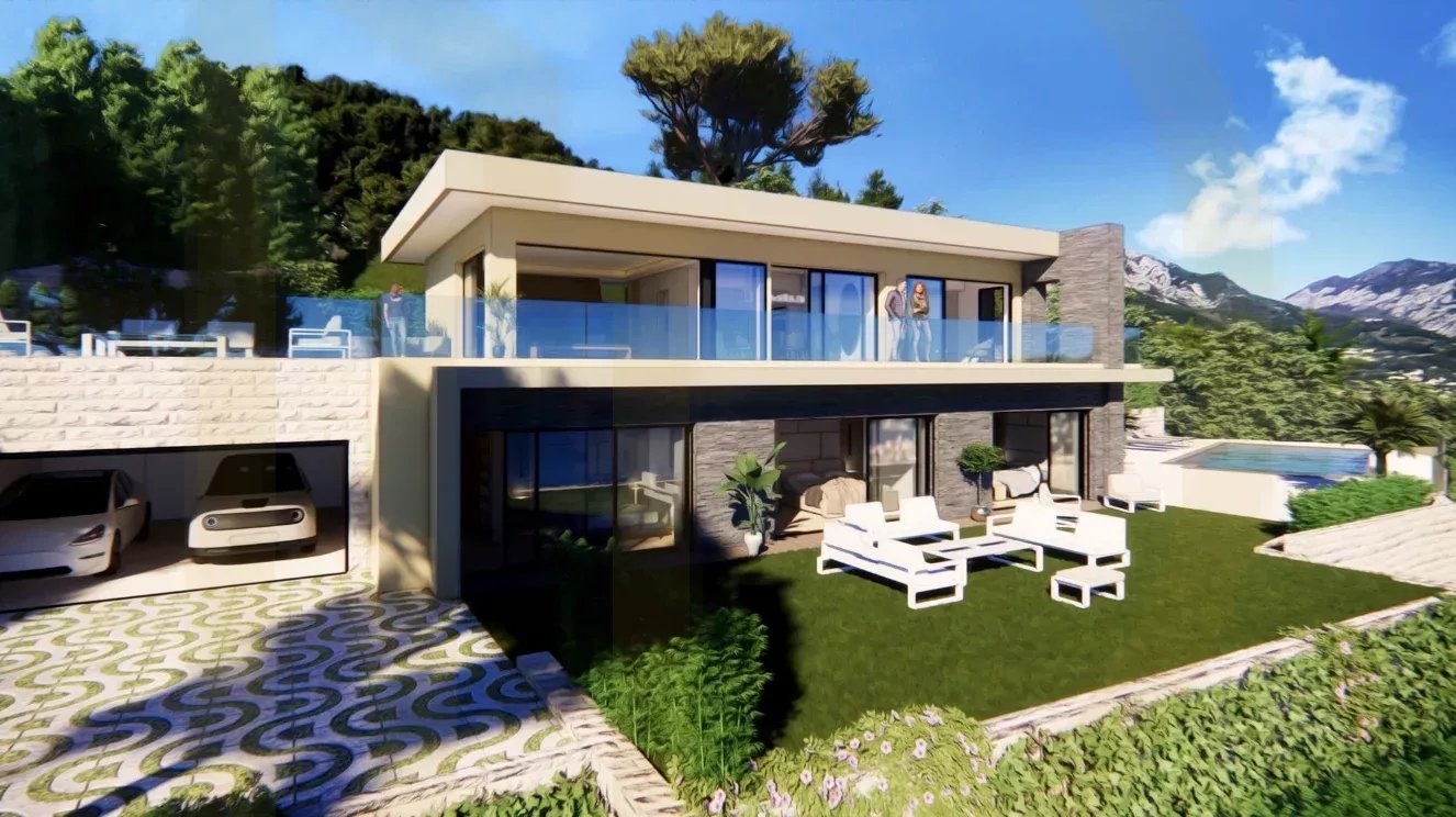 Situated in absolute calm, in a private and secure estate, this sumptuous new contemporary villa of approx. 238 m² enjoys a dominant position with a breathtaking view over the sea, from Cap Martin to Menton.